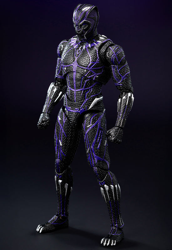 threezero and Marvel Studios are excited to introduce the DLX Black Panther (kinetic energy charged). This figure accurately replicates the Vibranium-weave suit worn by T’Challa, designed by the brilliant scientist Shuri. This version adds over 160 pad printing designs, and features UV fluorescent paint on the suit's purple stripes and accessories, mimicking the glow of Black Panther's suit when fully charged with kinetic energy, as seen in the movie.