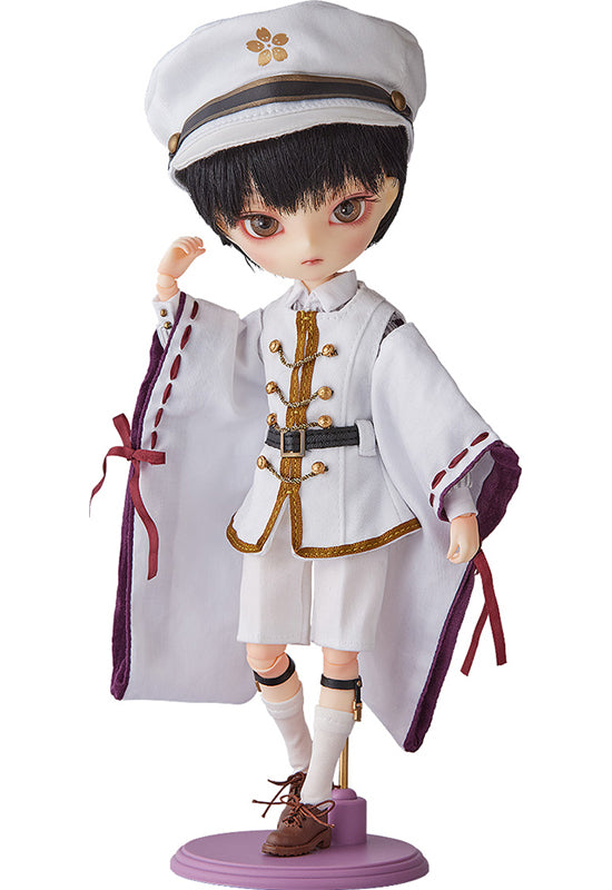 A blossom that heralds the end of spring. The next character to join Good Smile Company's doll brand "Harmonia bloom" is Edo Higan. Edo Higan features a jet black short hairstyle wig and Japanese-style makeup with lightly drawn eyebrows, striking red eyeshadow and sharp eyeliner. His glass eyes are a highly transparent gold color with flecks of gold, conjuring an image of cherry blossom pollen. Edo Higan's original outfit is based on a Japanese kimono and includes removable sleeves, a vest, and a gray striped shirt. Be sure to add this ephemeral and beautiful cherry blossom to your collection.