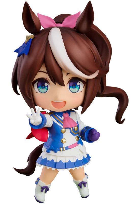 From the game "Umamusume: Pretty Derby" comes a Nendoroid of the Umamusume with exceptional flair and talent, Tokai Teio! She comes with three face plates including an energetic smiling face, a winking face, and a distressed face. Optional parts include a large Nendoroid base made to look like racetrack turf, a racetrack fence, and her favorite honey drink. Be sure to add the innocent and cheerful Tokai Teio to your collection!