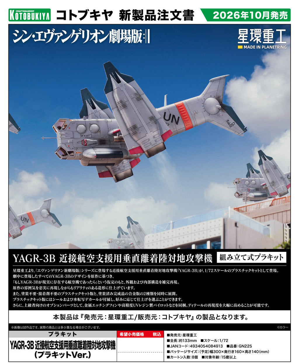 Seikan Heavy Industries presents the YAGR-3B, a close air support vertical take-off and landing ground attack aircraft from the "Evangelion: 3.0 You Can (Not) Redo" series, as a 1/72-scale plastic kit.