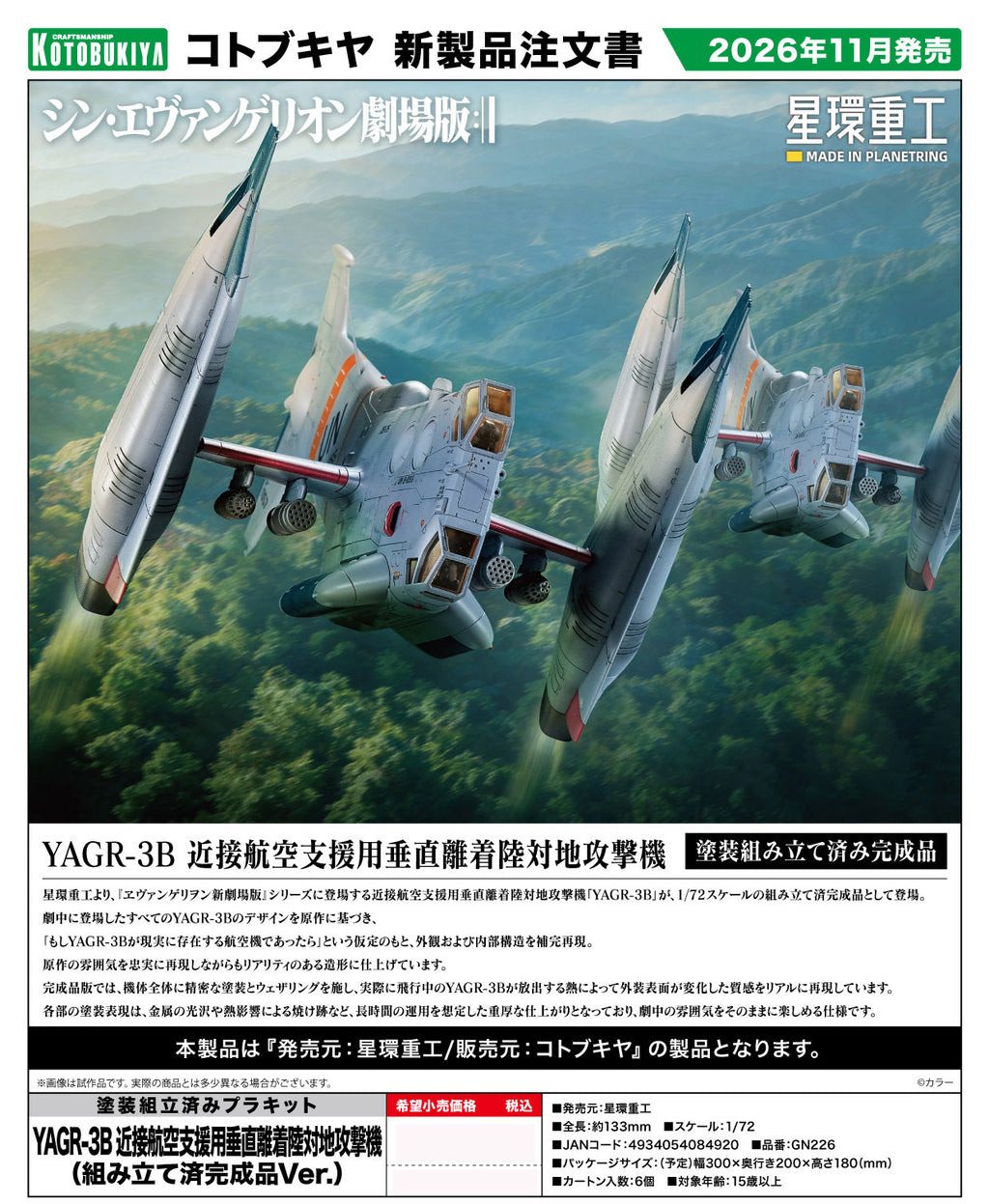 Seikan Heavy Industries presents the YAGR-3B, a close air support vertical take-off and landing ground attack aircraft from the "Evangelion: 3.0 You Can (Not) Redo" series, as a pre-assembled 1/72 scale model.