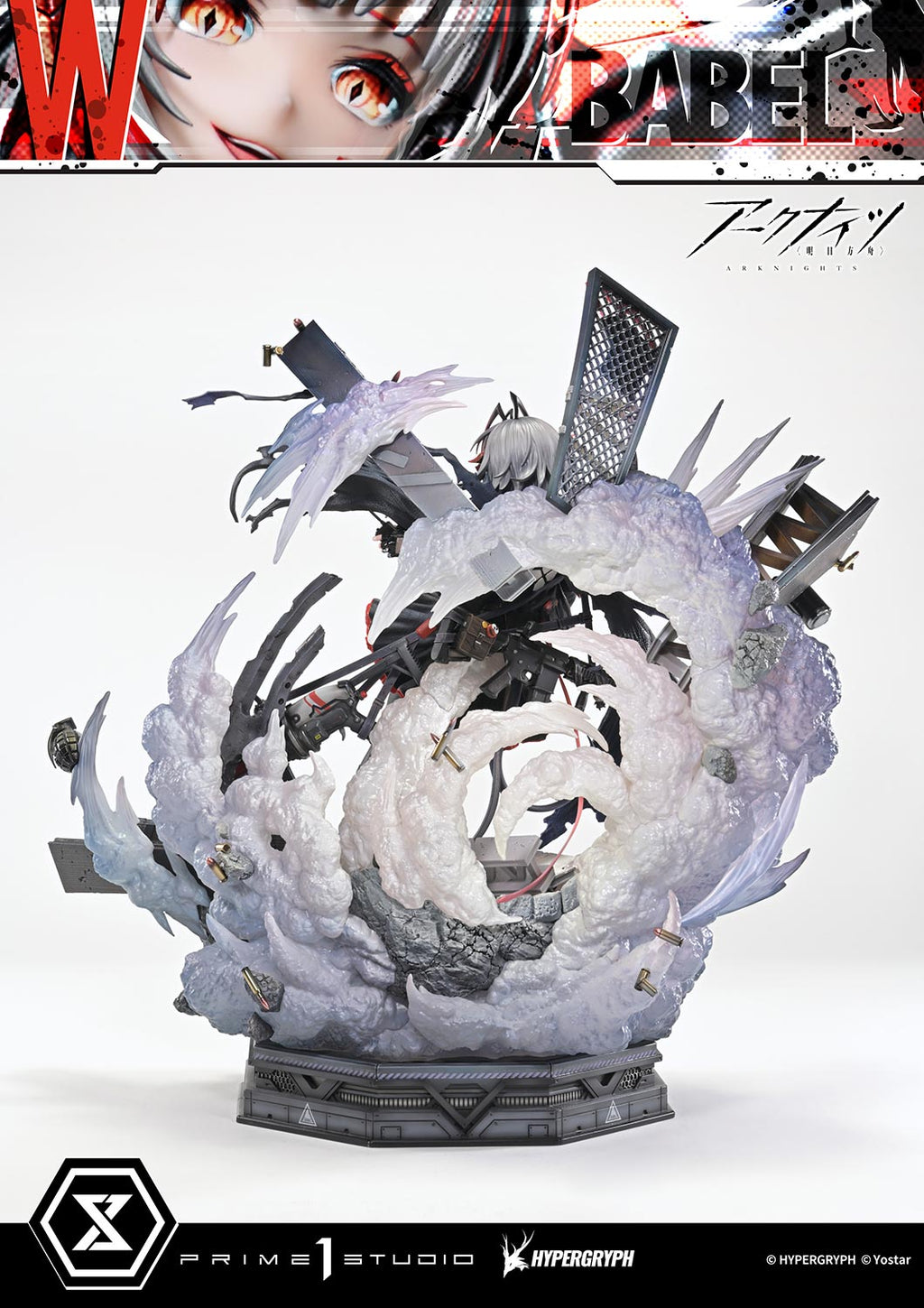 Amid the wreckage of a battlefield torn apart by explosions, the Sarkaz grenadier W wears her trademark mischievous smile. This 1/6 scale statue captures her Elite 2 appearance—an embodiment of her very essence. The piece features a striking circular composition and a sense of weightless motion, realized through a dynamic, three-dimensional layout unique to a physical statue. Every element emphasizes her commanding presence as the master of destruction.