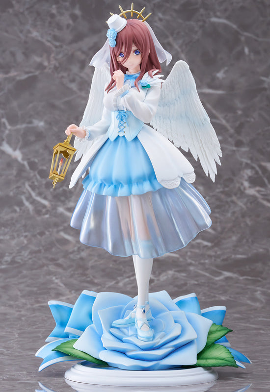From the anime series "The Quintessential Quintuplets ∬" comes a scale figure of Miku Nakano! From the anime series "The Quintessential Quintuplets ∬" comes a scale figure of Miku Nakano! The figure features Miku in a new angel inspired outfit that includes an adorable sheer dress, wearing a shy and innocent expression on her face. The base is decorated with a gorgeous ribbon and rose in Miku's color blue. Be sure to welcome the mysterious Miku into your collection!