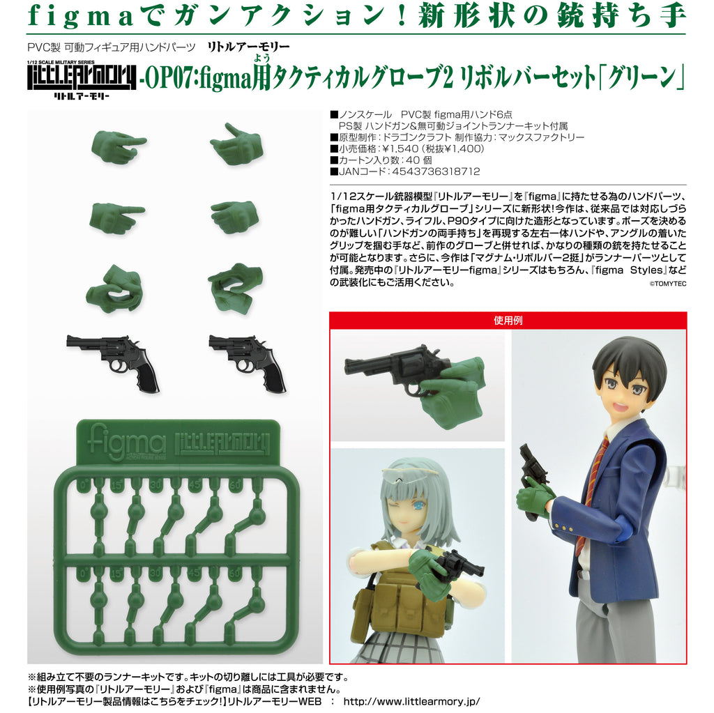 TOMYTEC's 'Little Armory' series is a set of weapons that can be used by 1/12th scale figures. This set of figma hands allows figma figures to hold the weapons from the Little Armory set! In particular, this set is made to display your figures holding handguns, rifles and P90 type weapons that were difficult to use with previous handsets!