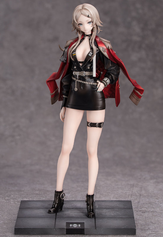 With her combat saber slung at the waist, D stares with a piercing gaze. Her red coat is finished with multi-layered gradient paint, while the deep V-neck shirt reveals a glimpse of her chest. The black bodycon miniskirt in semi-transparent material subtly hints at the skin beneath. A silver belt gathers the shirt, creating delicate folds. The transparent half-sleeve on her right shoulder recreates the design of the original artwork, and accessories on different parts are accentuated with metallic paint for enhanced detail.