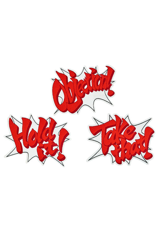 This set of embroidered patches features famous lines from the "Ace Attorney" series!
