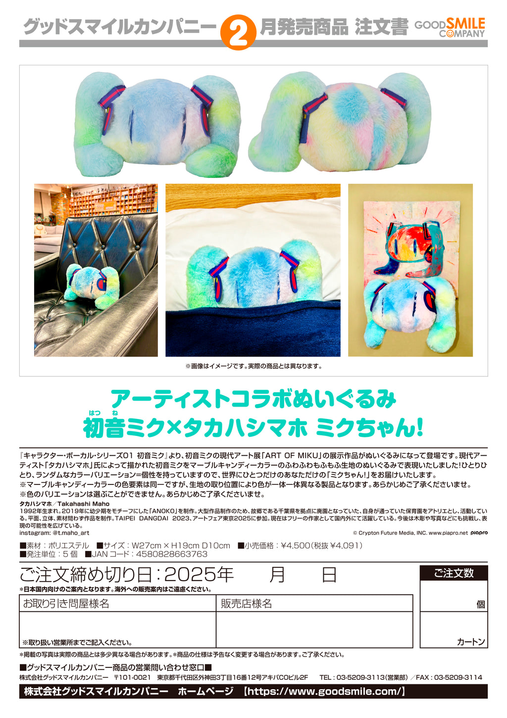 From "Character Vocal Series 01: Hatsune Miku" comes a plushie of the artwork displayed at the Hatsune Miku contemporary art exhibition "ART OF MIKU". The plushie features Hatsune Miku as drawn by contemporary artist Maho Takahashi, in a marble candy color scheme! Each plushie comes in a random color variation, making each Miku-chan! unique.