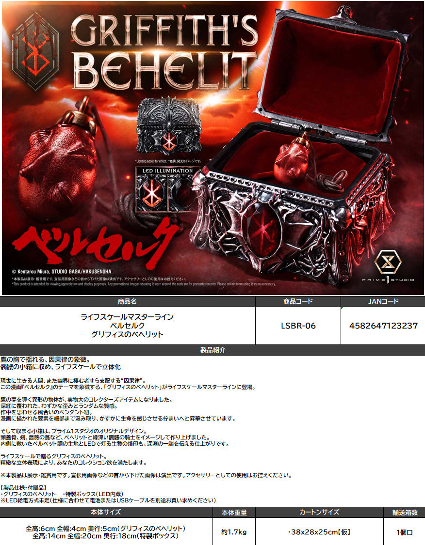 The Law of Causality—a force that governs those who walk the mortal world and even those who dwell in the astral. Griffith’s Behelit, a symbol of this core theme of "Berserk", now joins the Life-Scale Masterline series.
