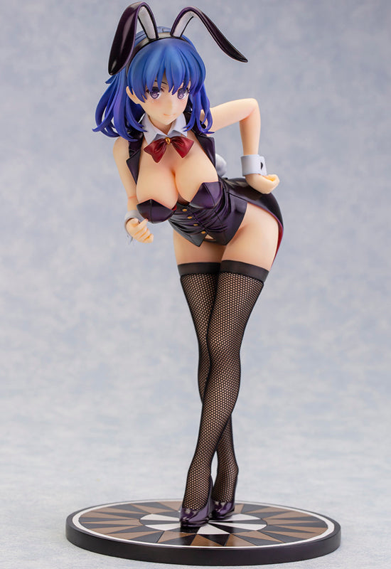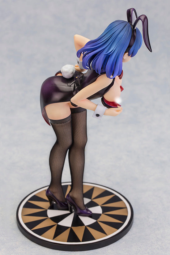 In this pose, she places her finger on the bunny suit, while bent over. The contrast between the real tights and straight legs that wrap the sleek legs is also fascinating.