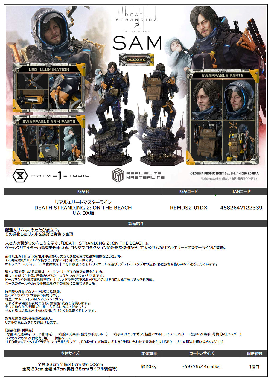 Set in a world that explores what's beyond human connection, "DEATH STRANDING 2: ON THE BEACH" is the latest masterpiece from Kojima Productions, led by renowned game creator Hideo Kojima. From this groundbreaking title, Sam—the legendary porter—joins the Real Elite Masterline series by Prime 1 Studio.