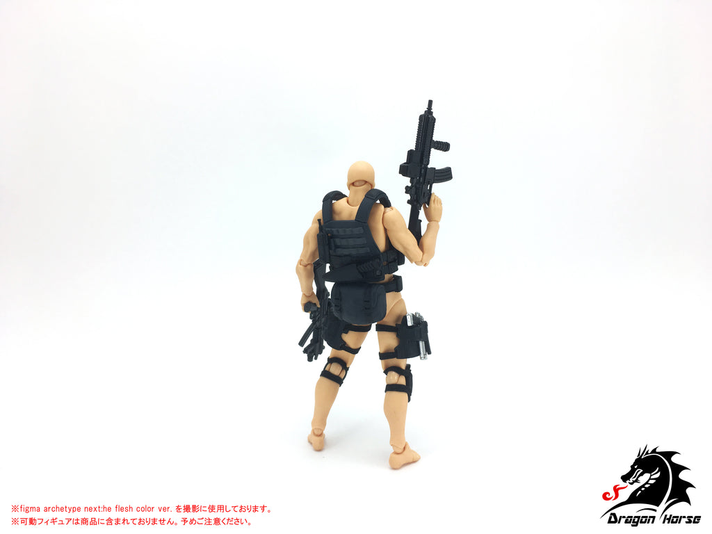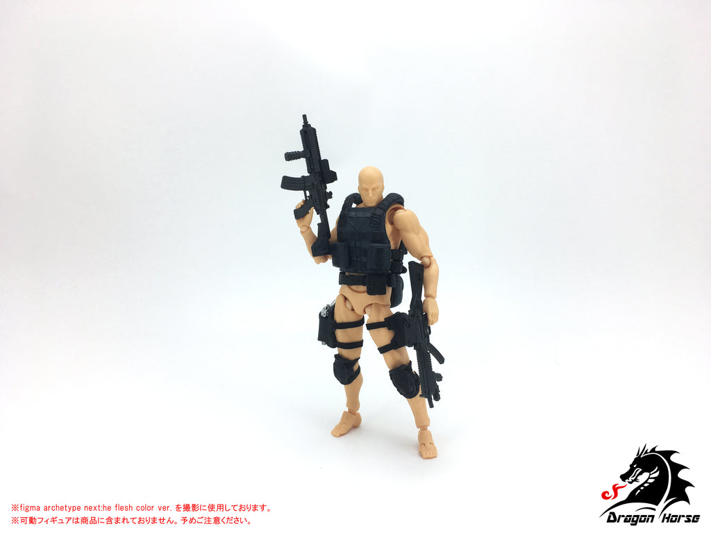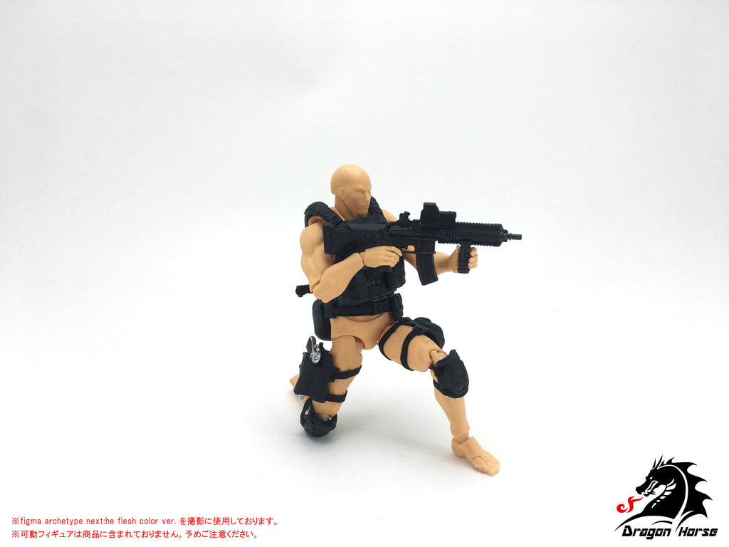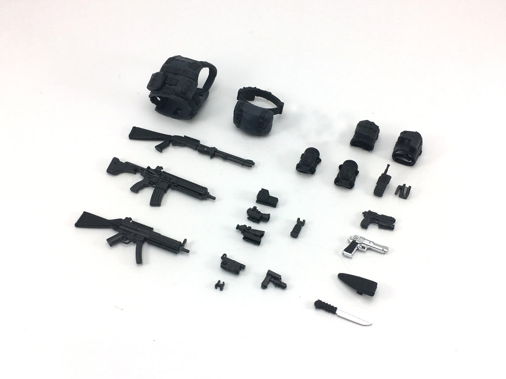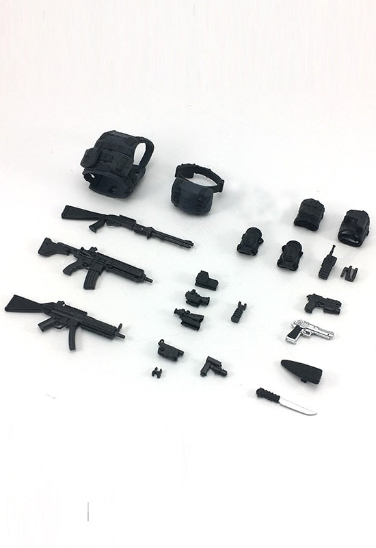 These are military style equipment sets containing weapons such as assault rifles and handguns, as well as normal gears such as tactical vest and leg pouches. There are two different sets, Set-A "Assault" has more firepower while Set-B "Ghost" is more suitable for infiltrate operations. We've also prepared abundant accessories for the main weapon, HK416 assault rifle, to offer enough room for your customizations. Last but not least, elastic cords are used on the leg pouches and knee pads so that they can be used on all kinds of 1/12 scaled figurines.