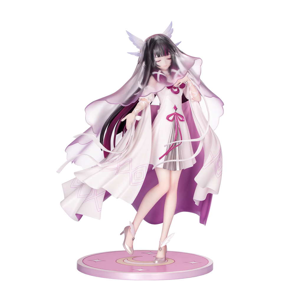 Columbina is dressed in an elegant, pure white dress. A detachable sheer veil with a matte texture, like flowing, hazy moonlight, gently drapes over her. The sleeves and cape lift gently, dotted with sparkling glitter on the surface, while the inside reveals a soft and elegant gradient of pink and purple. With one hand resting lightly on her chest and the other slightly raised, ribbons twine around her arms, fluttering as if carried by a breeze. That nameless melody seems to whisper softly in your ears at this very moment...