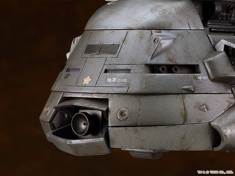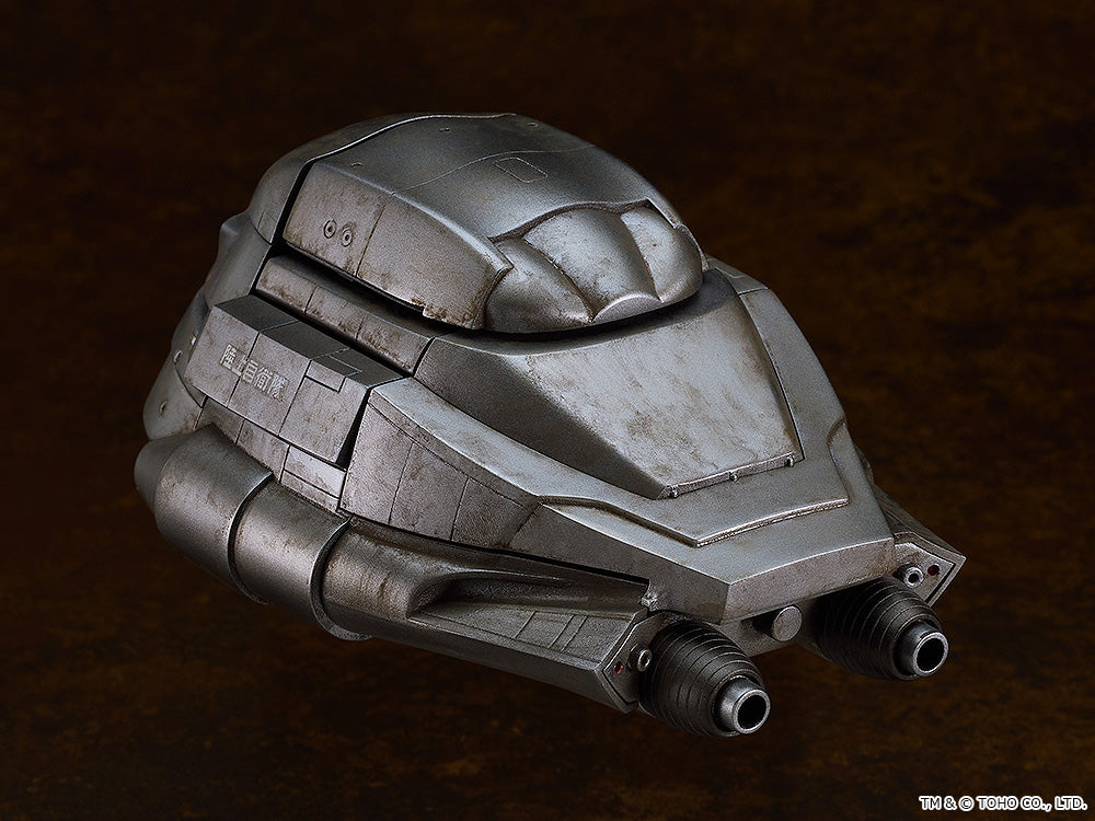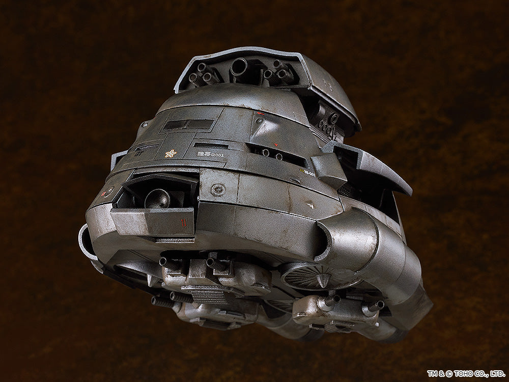 MODEROID Super X, launch! From "The Return of Godzilla" comes a MODEROID plastic model of the Main Sky Battle Tank Super X! · The model is approximately 135mm in length. · The concealed turret at the top of the craft can be deployed. The telescoping barrels of the main gun and Type 68 Kai 84 Type 30 Rocket have been recreated as well. · The cover of the 1800mm Yoso Searchlight and fuselage hatch can be displayed open or closed. · The jet fans on the bottom of the fuselage are movable. · The 300mm Kano Gun M29C is movable, and its barrel can be swiveled. · The various parts of the mecha have been separated into various colored runners, and the model kit also comes with water-slide decals, making it easy to recreate the aircraft from the movie with a simple assembly. · The model is the same scale as the MODEROID Super X2 (sold separately).