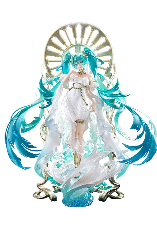 Hatsune Miku, the Muse of Creation. From "Character Vocal Series 01: Hatsune Miku" comes a 1/6 scale figure of Hatsune Miku, the Muse of Creation. as designed by illustrator Yoneyama Mai! Hatsune Miku dressed as a goddess, combined with a background of nature-like motifs such as plants, has been exquisitely sculpted to retain the atmosphere of the original illustration. Her twin tails that resemble wings make use of translucent parts and pearlescent paint was used on the pure white outfit for an elegant finish. Be sure to add the benevolent smiling Miku to your collection!