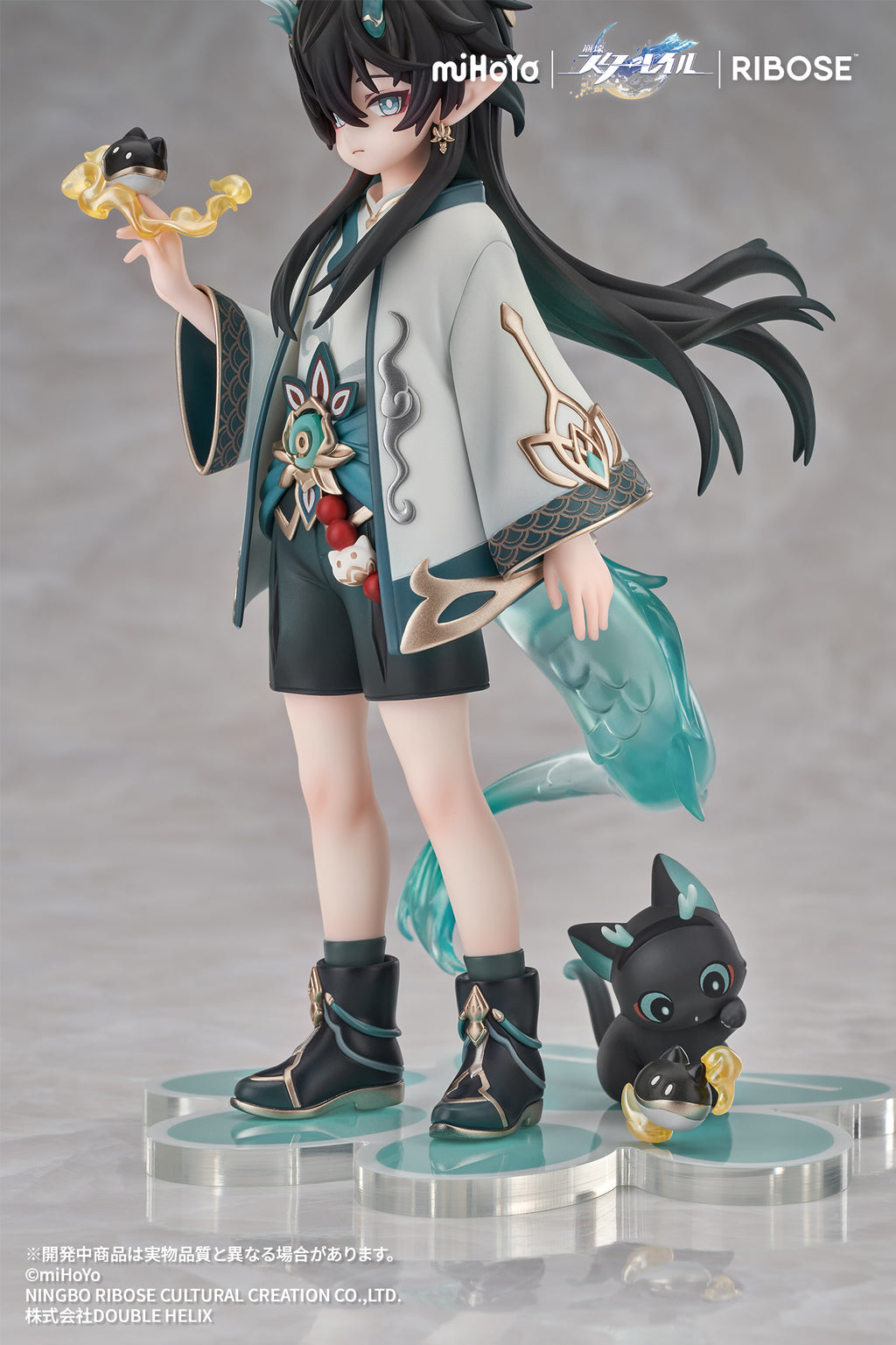Under the planning and production of RIBOSE, here comes the pvc figurine of Dan Heng - Imbibitor Lunae from the game "Honkai: Star Rail"! Dan Heng is dressed in pale blue and white, standing cool in the wind. At his feet, a little black cat snuggles up and plays, making the scene extra cute.