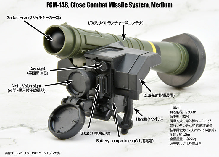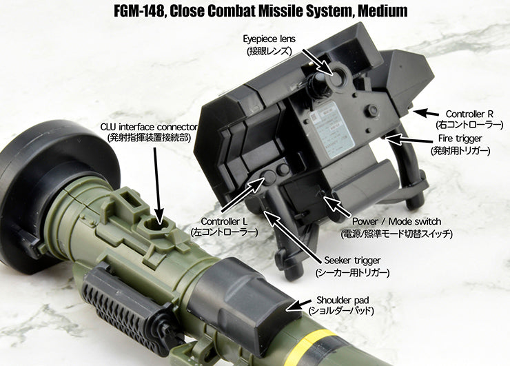 The most powerful anti-tank missile is precisely reproduced in 1/12 scale. The firing sequence can be recreated by attaching and detaching the sight and muzzle cover. A new tripod part is also available to make it a fixed gun. A more realistic finish is possible by using the included decals. This product can be enjoyed both as a display and as an action model.