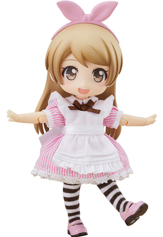 The Nendoroid Doll series of palm-sized action figures feature the same heads as standard Nendoroids, but alternate doll-like bodies that are highly articulated and can easily be dressed-up into different outfits! This new version of Nendoroid Doll Alice features the original character Alice in an adorable pink outfit. Her cute striped dress comes with a removable apron. The head part of the Nendoroid can easily be switched with previously released Nendoroids allowing you to dress-up your favorite characters in an all new outfit!