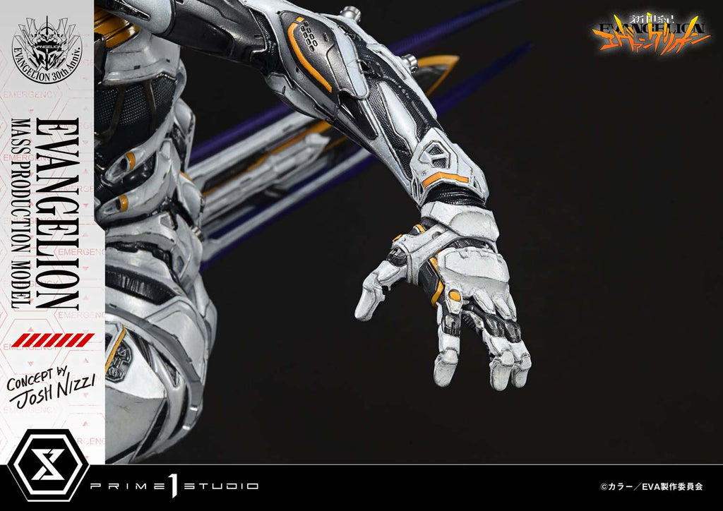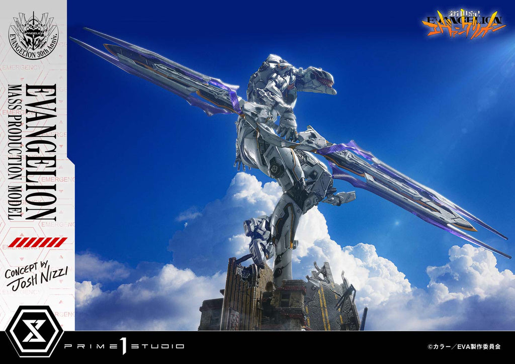 Featured in "Neon Genesis Evangelion: The End of Evangelion", this aberrant series of Eva units left countless viewers scarred. This statue accentuates their soulless, uncanny presence through concept design by Josh Nizzi. While honoring the original organic form, it incorporates intricate details such as panel lines and internal mechanisms. The white-based color scheme is complemented by metallic, muted silver and accented with a warning yellow. The purple-hued sword is imbued with a sharp tension within its delicate sculpt.