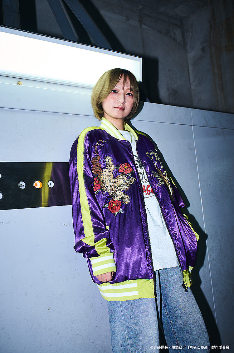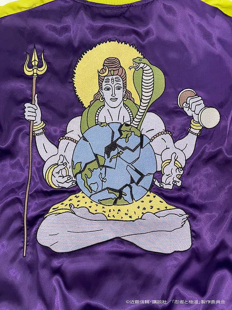 From "Ninja Vs. Gokudo" comes a a souvenir jacket featuring embroidery of Kiwami-san's "Shiva destroying the world" tattoo, in the color scheme of Shinoha-kun's bodysuit color scheme! Despite its flashy design, the jacket features an oversized design that fits a variety of sizes for a wide variety of sizes! Be sure to add this statement piece for a fun touch to your wardrobe!