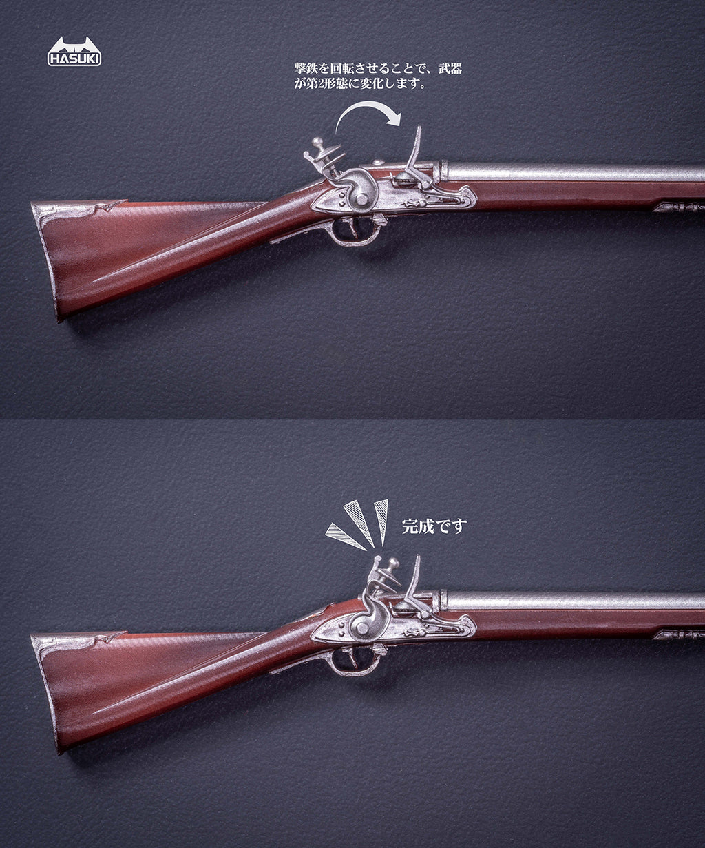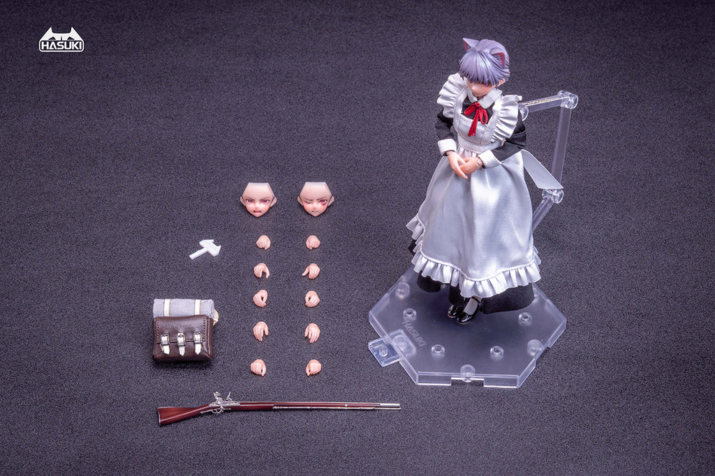 Main figure, Cloth costume set, Alternative face part x3 (Expressionless, Screaming, Restrained, Default included w/Adjustable eyes), Alternative hand part x12 (Including default.), Backpack x1 set, Flintlock musket x1, Stand base x1 set