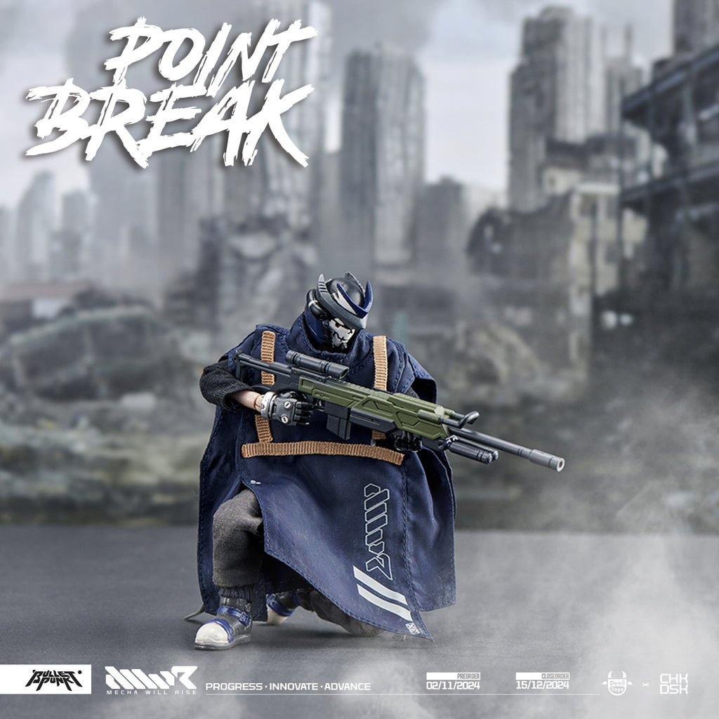 This 1/12-scale action figure of DXIII is from Devil Toys' original series "Point Break." He and his companion Carbine finally face their strongest enemy, the legendary TEQ63 and its powerful armored mech suit known as Nutbuster -- and now they must do everything within their power to grab a ray of hope! This incredibly posable figure comes with a two-in-one blade and his complete outfit; he's also available in a set with Carbine. Order him for your own collection today!
