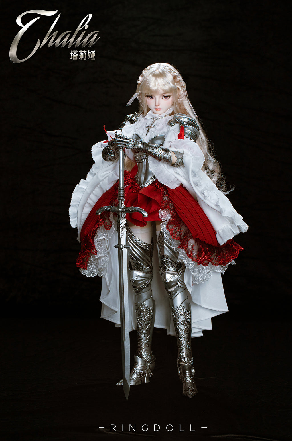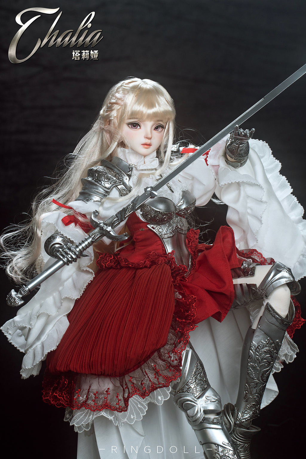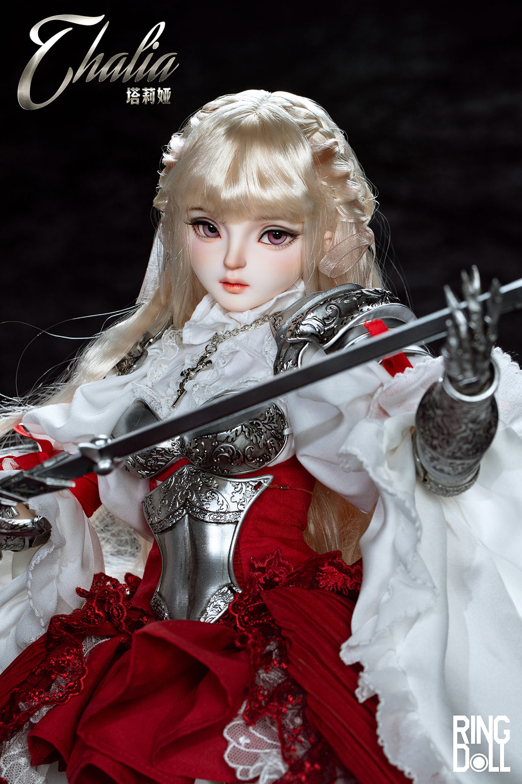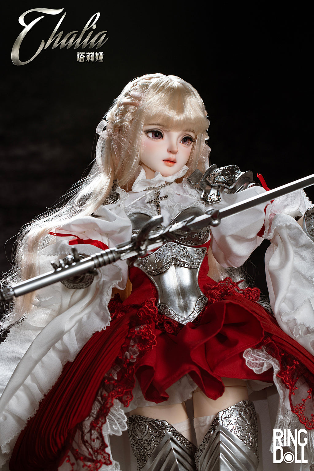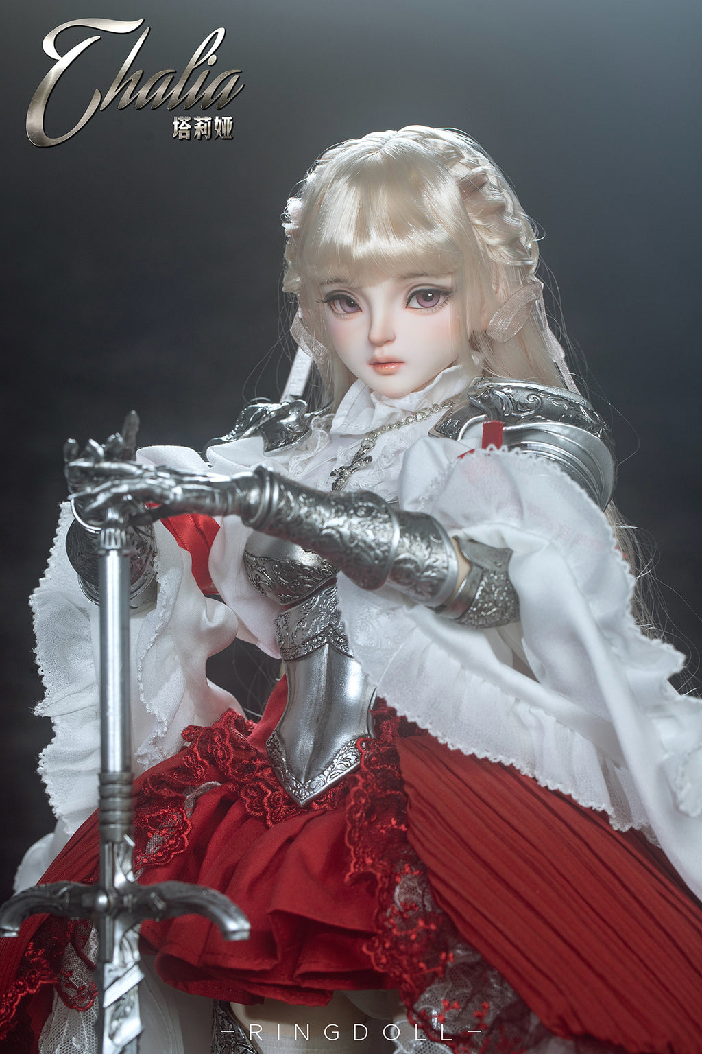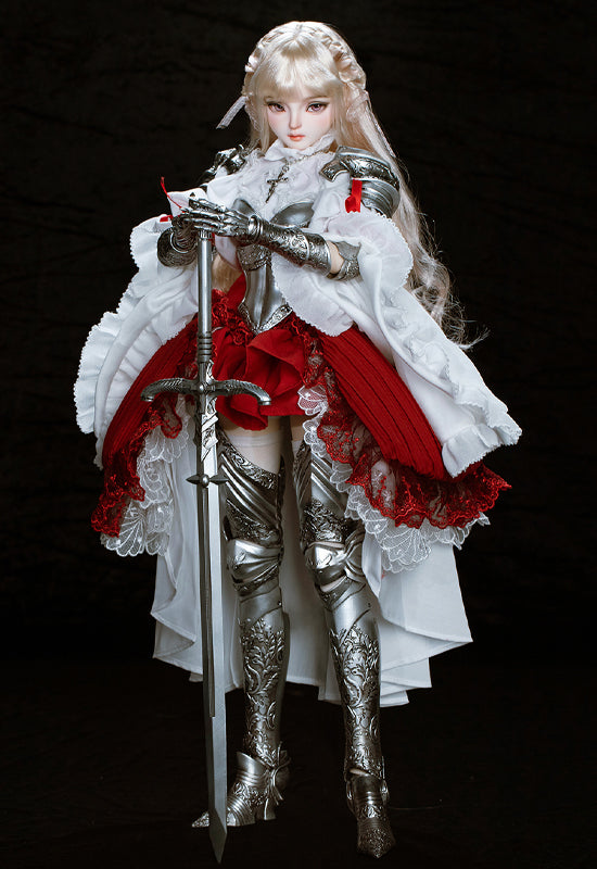 Planned and produced by Chinese BJD manufacturer Ringdoll, we bring you this 62cm ball-joint doll of Ringdoll's original character Thalia. Her silver armor, the costume adorned with delicate lace, her dignified expression, and the longsword have all been meticulously crafted. We hope you enjoy the majestic world where the medieval and fantasy elements are beautifully merged.