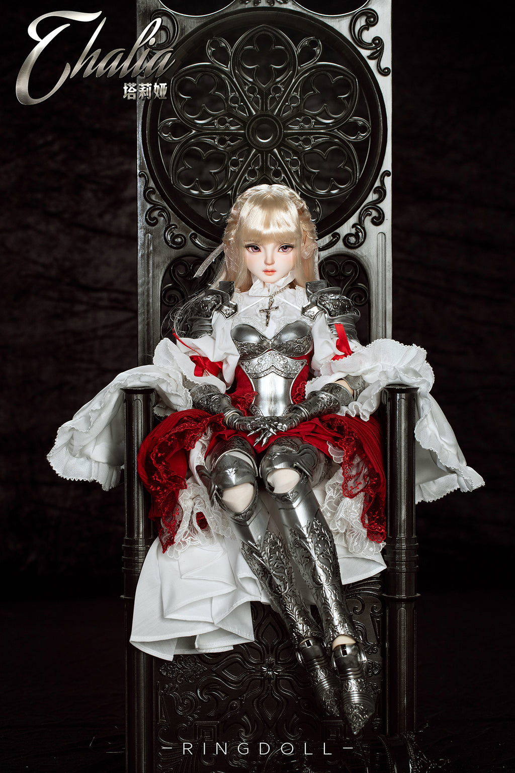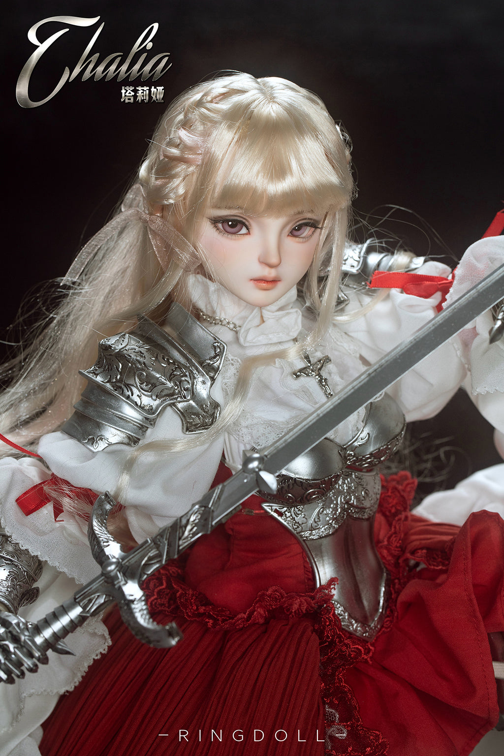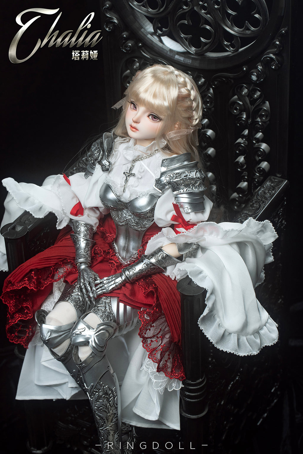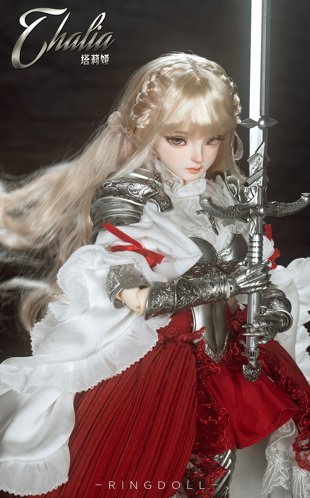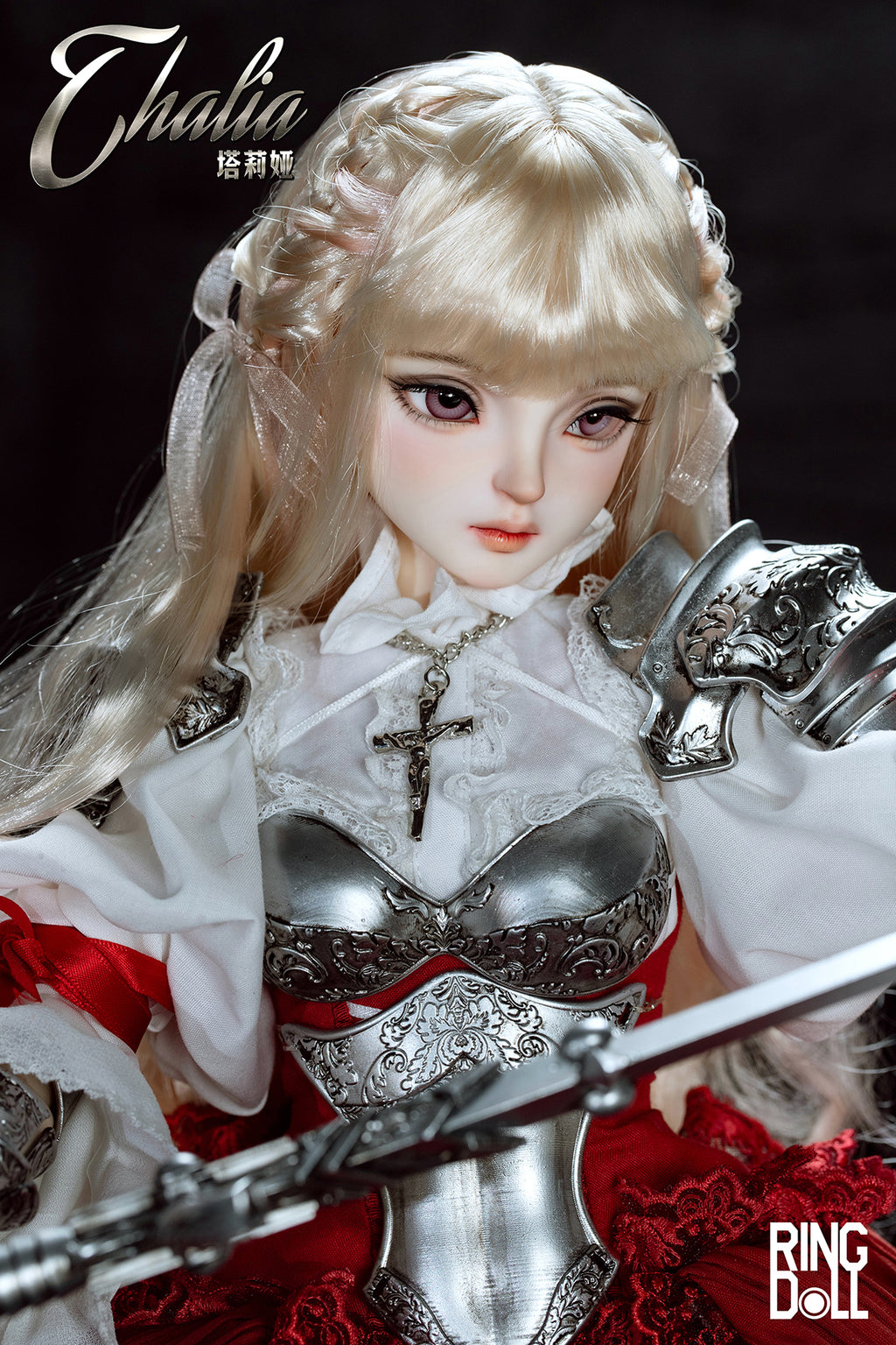 Planned and produced by Chinese BJD manufacturer Ringdoll, we bring you this 62cm ball-joint doll of Ringdoll's original character Thalia. Her silver armor, the costume adorned with delicate lace, her dignified expression, and the longsword have all been meticulously crafted. We hope you enjoy the majestic world where the medieval and fantasy elements are beautifully merged.