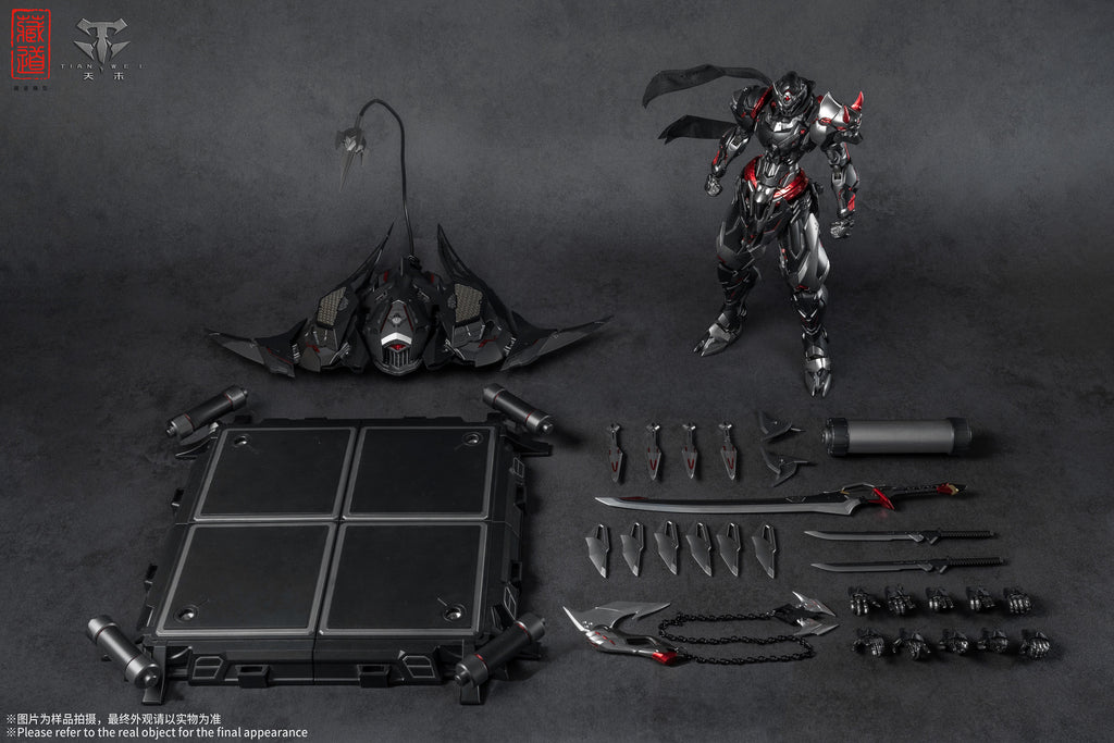 Originally designed and manufactured by Chinese manufacturer ZEN Of Collectible and under the original alloy mecha series "Shadow Realm Series Zhan Ming", here comes the new ninja type mecha "Black Phantom"! Equipped with wide variety of accessories and the multifunctional flying vehicle that he can ride to create an even more overwhelmingly cool figure! Don't miss out!