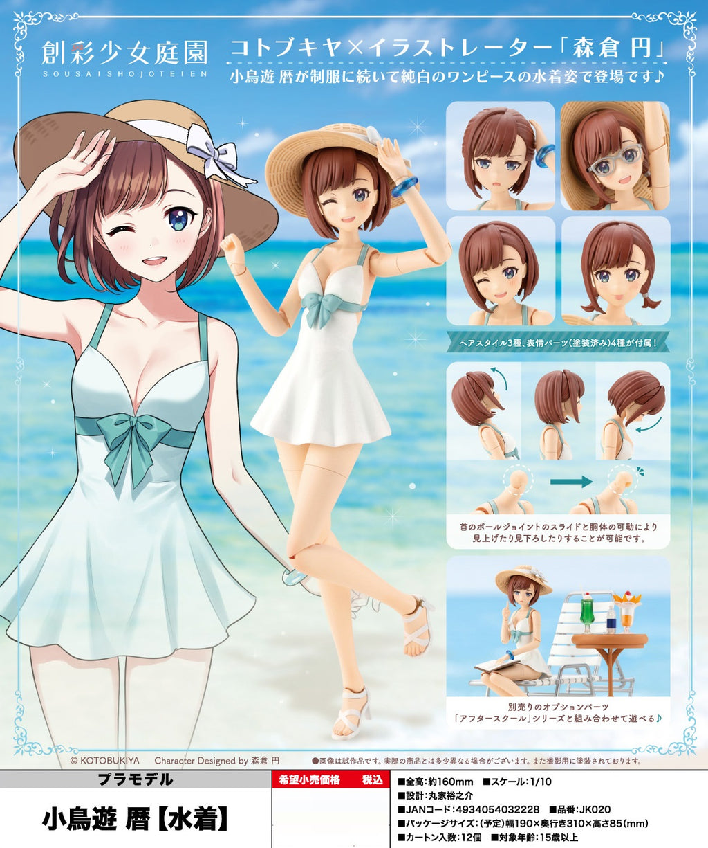 Koyomi's swimsuit is a simple one-piece with a ribbon on her chest and a bold design with cross straps on the back. Parts such as her straw hat and high-heel sandals are partially pre-painted. The sitting body and fixed legs allow for more natural poses.