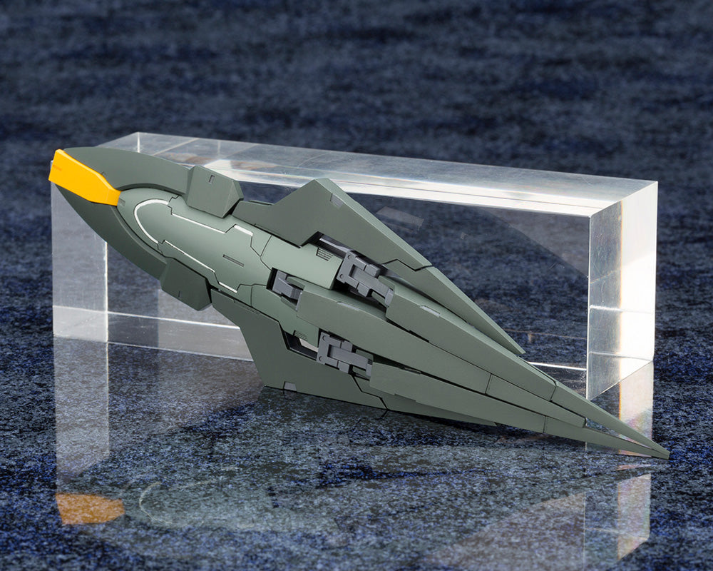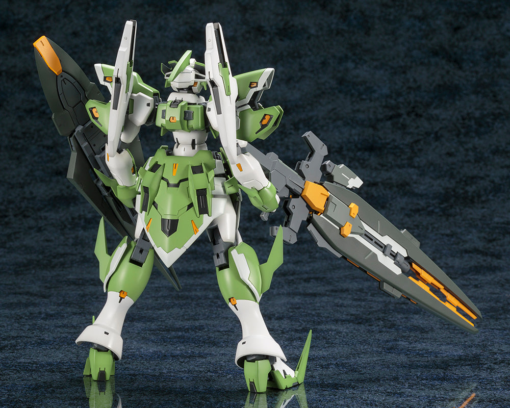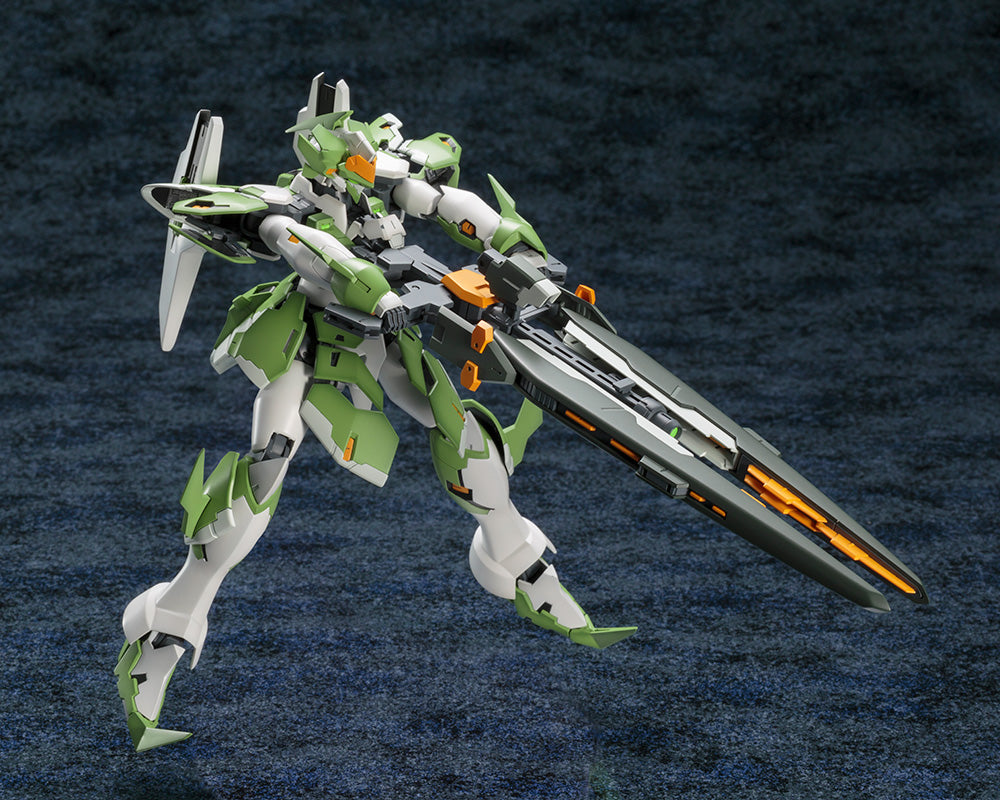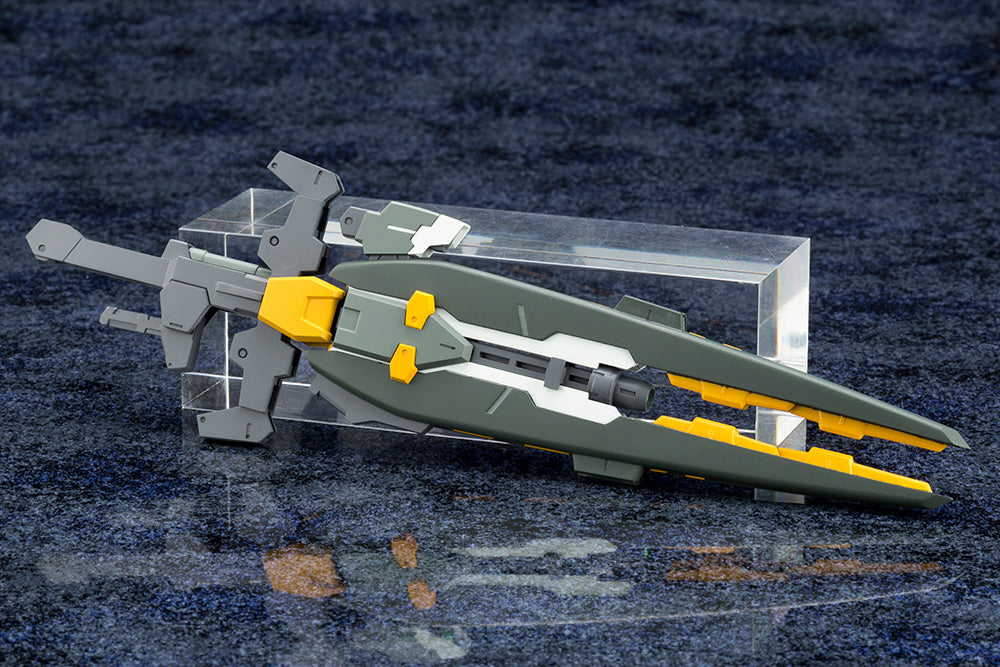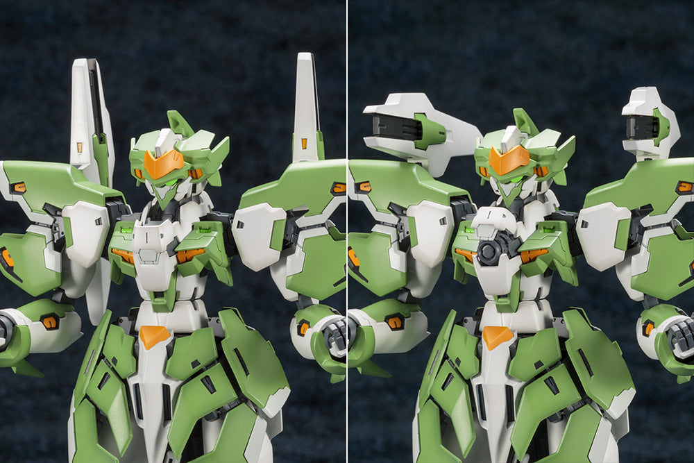 Like the RAFTCLANS AURUN model, this model comes with the parts to recreate the Orgone Sword Rifle and Orgone Materilization along with a shield. The grip on the Orgone Sword Rifle is movable, and can be configured into sword and rifle formations.