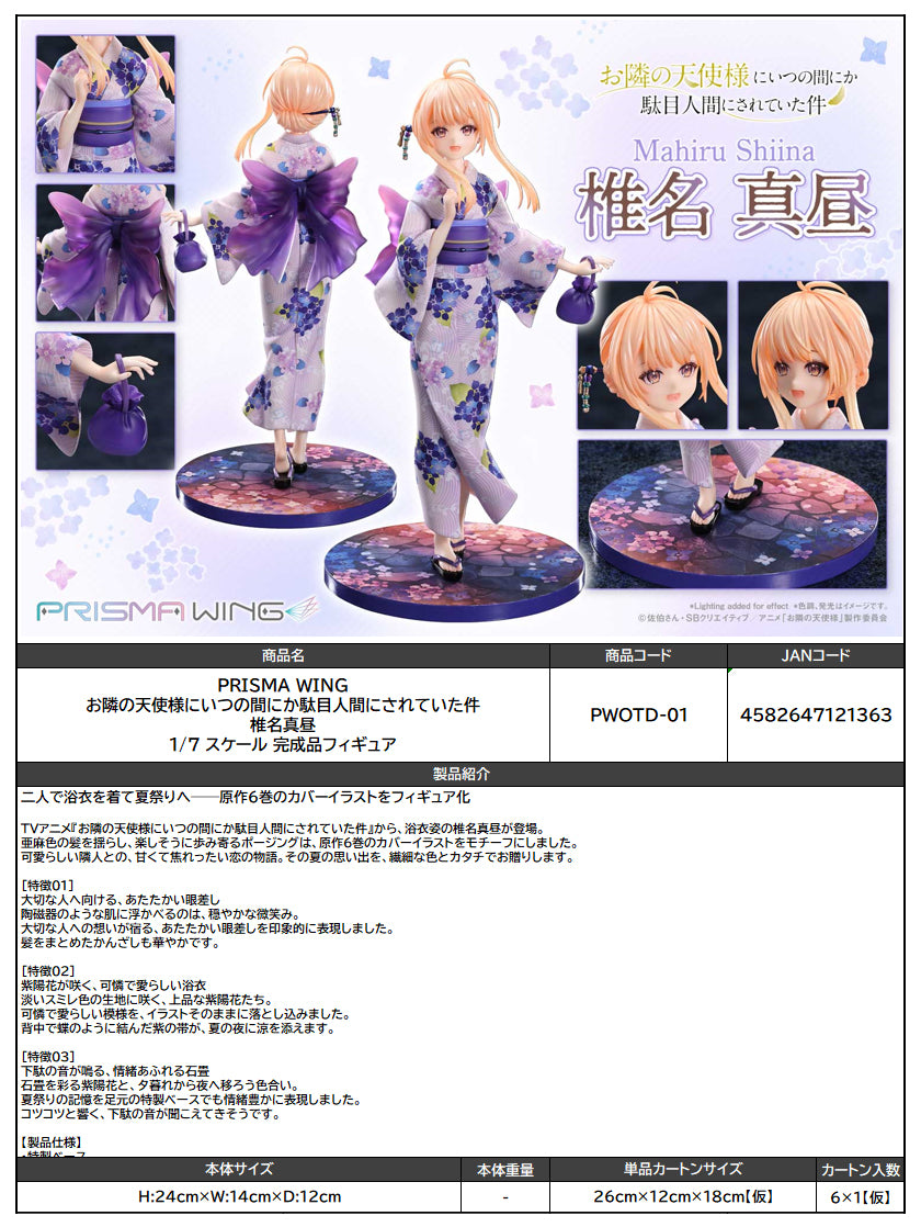 From the TV anime "The Angel Next Door Spoils Me Rotten" comes Mahiru Shiina in her charming yukata. With her flaxen hair swaying and a joyful step forward, this pose is inspired by the Volume 6 cover illustration. A sweet and heart-fluttering story of love with the girl next door — now captured as a summer memory in delicate colors and form.