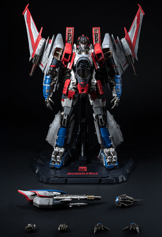 DLX Starscream stands approximately 27 cm (10.6 inches) tall. DLX Starscream features newly sculpted parts including head, signature shoulder intakes, and other details and elements across his body, arms, and legs. He also features a magnetically controlled eye lighting system, and a die-cast alloy internal frame for enhanced durability and handling, with approximately 51 points of articulation. The knee joint structure has also been reconfigured using die-cast alloy. This allows the figure to offer excellent balance and dynamic posing, providing a premium feel. The body showcases precise, sculpted details and mechanical structures, combined with threezero's signature battle-damaged weathering techniques, which carefully reproduces mechanical abrasions for realistic textures.